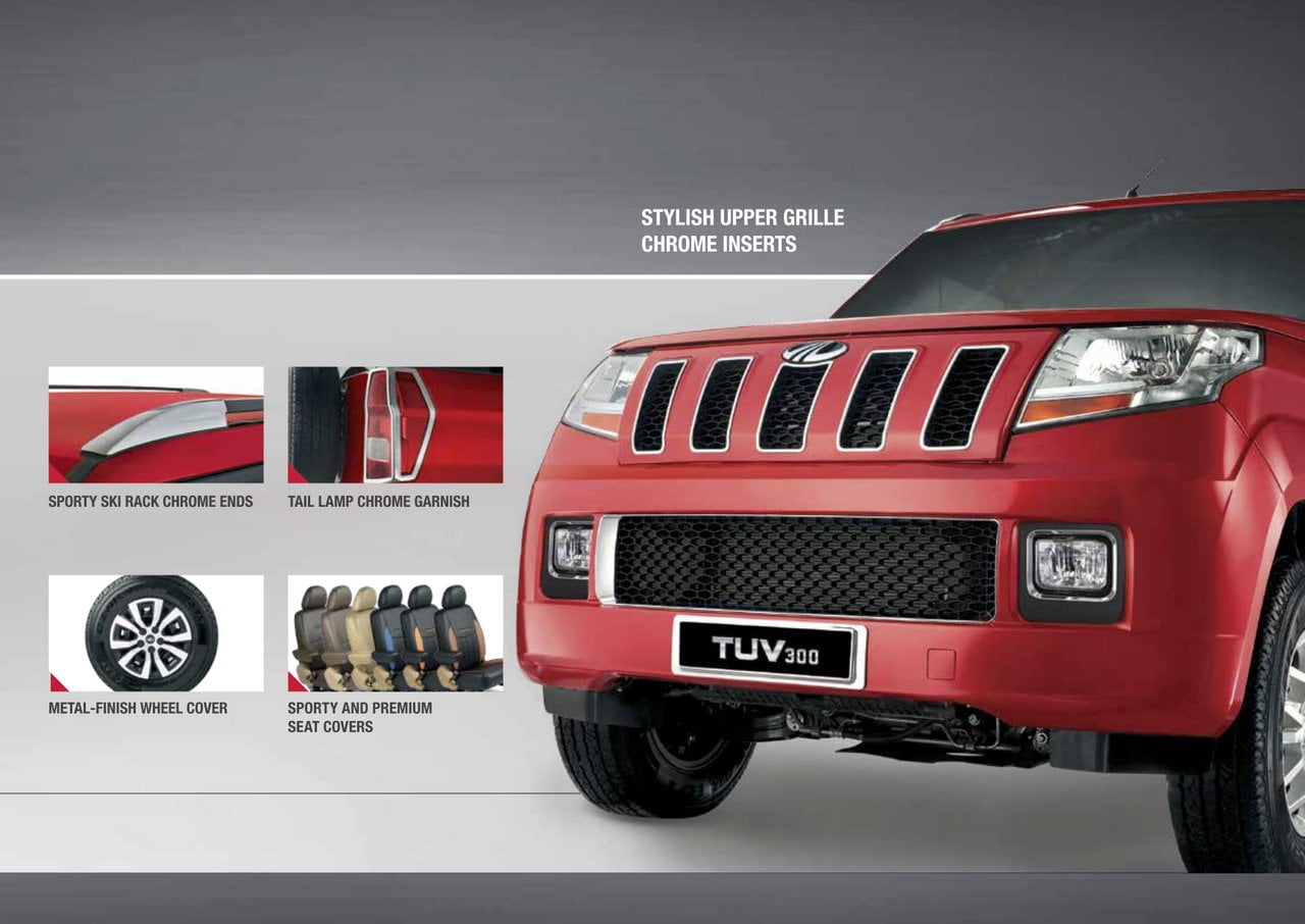 Mahindra & Mahindra has announced a set of accessories for the TUV300. This accessory pack includes a protector for the air dam, more rugged scuff plates for the front and the rear, a hood hull, side skirts, flared wheel arches, andย marker lamps with shroud. You also get some chrome appliques, a roof-mounted rear spoiler, metallic wheel covers,ย illuminated scuff plates, and a more premium seat upholstery. You can also pick up someย side protector, side steps, a roof carrier, bicycle carrier, all-weather floor matsย andย machined alloy wheels.
