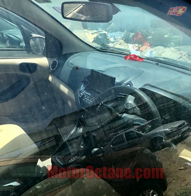 Now the first thing that we see is the 6-speed DCT unit. Also, you can see the new floating touch-screen infotainment system. It continues with a black-beige dual-tone interior. The spied mule is the top-end variant as you can see the engine start-stop button. The rest of the interior looks similar to the Ford Freestyle.