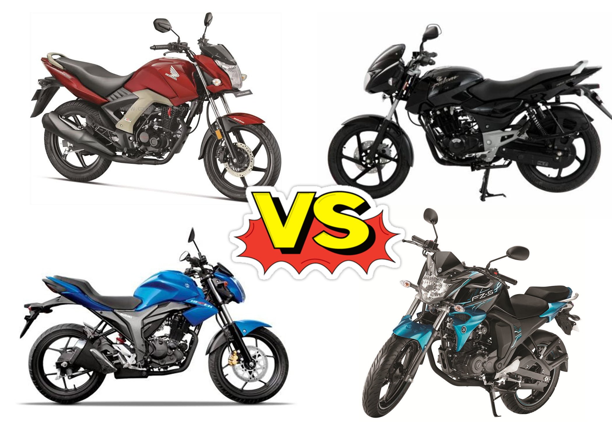 Honda Unicorn 160 vs Bajaj Pulsar 150 vs Yamaha FZ V2.0 FI vs Suzuki Gixxer — Spec Sheet Comparison