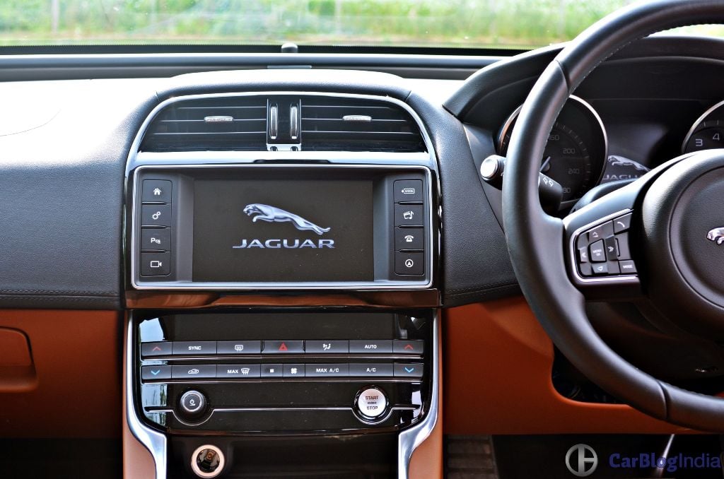 On the inside, it is not as luxurious or fancy as some of its competitors, but it still makes you feel special. Be it the beautiful ‘Riva Loop’ that runs across the dashboard connecting the doors, or the gear selector knob that rises up every time you turn the car on, there’s a definite sense of occasion about everything. Heck, even something as trivial as the start/stop button blinks to the tone of a beating heart urging you turn on the ignition. Jaguar’s updated InControl touchscreen system goes about its job without giving too much to complain about. However, it is still a few notches below the systems being offered by the competitors. The front seats come wrapped in beautiful Siena Tan Windsor leather and offer a comfortable, snug fit. In case you do find yourself in the rear, it’s not a bad place at all. For an average-sized Indian, there’s decent legroom and headroom. However, the intrusive transmission tunnel and rear AC vent mean seating three will be a squeeze.