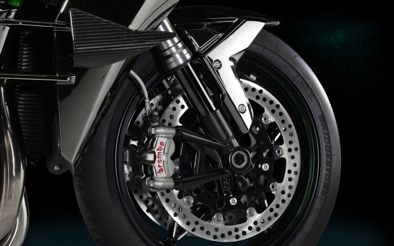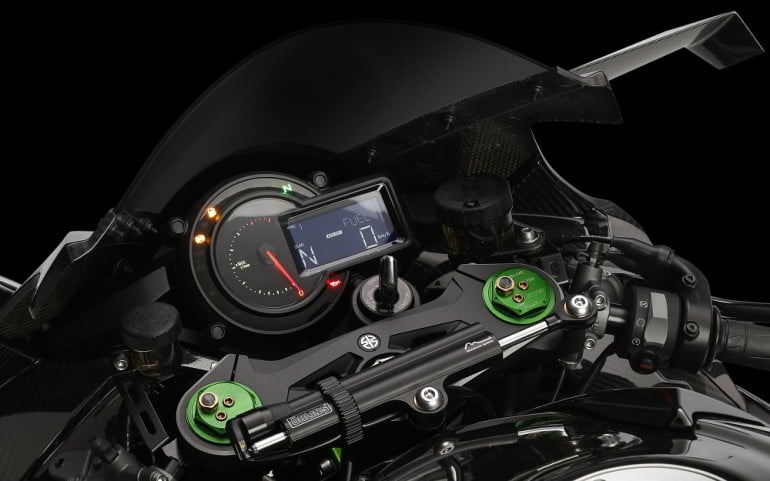 The Kawasaki Ninja H2R is a strictly track only bike so it doesn’t feature headlamps, turn indicators, rear view mirrors, etc. A street legal version of the motorcycle, Kawasaki Ninja H2 is expected to be unveiled at EICMA in November featuring the same engine but in a different state of tune.