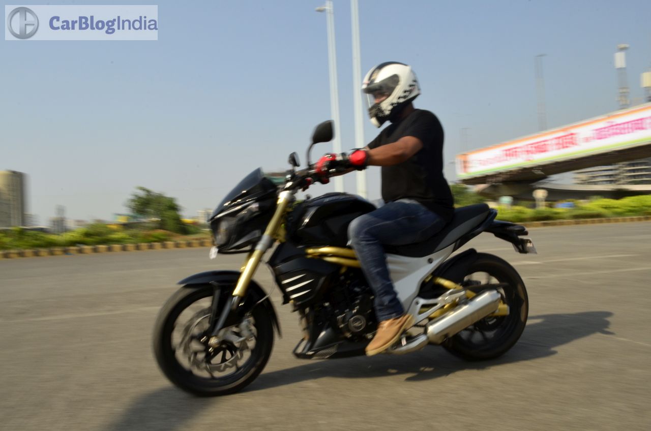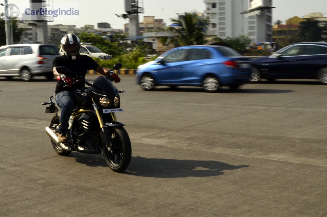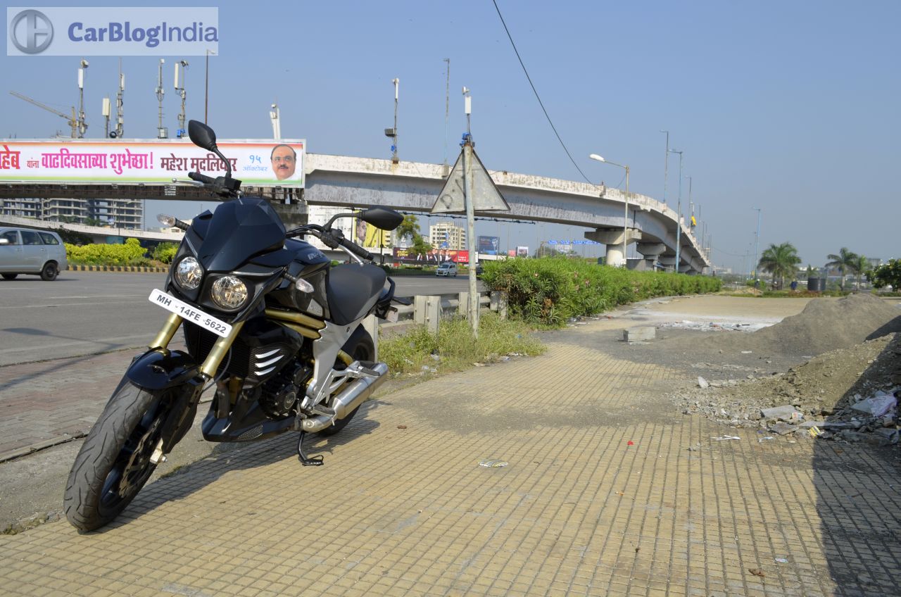 While the new Mahindra Mojo 300 offers a great ride quality, it’s in the handling department that it lacks similar levels of finesse. Don’t get us wrong though, for the Mojo can be comfortably ridden to your favorite ghats. However, what leaves us a tad disappointed is the slightly ‘front heavy’ nature of this motorcycle. Also, the long wheelbase and the high kerb weight ensures that you need to flex a couple of muscles to have this motorcycle change directions. However, where this bike simply excels is the road grip on offer. The new Mahindra Mojo 300 comes shod with excellent Pirelli Diablo Rosso II rubber, which means that there’s almost always a colossal amount of grip to play with. The sticky nature of the tires amplifies the cornering prowess of this motorcycle and goes on to inspire more confidence to the rider. The Diablo Rosso IIs do play a vital role in enhancing the handling characteristics of this bike.