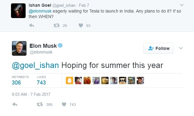 In February this year, in a recent Twitter conversation, Tesla CEO Elon Musk stated that he is hoping to bring the brand to India by the summer of 2017. Tesla is currently active in many international markets including China. The electric car market in India is still in a very nascent stage with the Mahindra e2o and the eVerito being the only offerings. Tesla might also be looking to invest in battery manufacturing and car manufacturing plants in India. However, in his latest reply to a tweet asking him about Tesla’s launch in India, he has hinted there might be a delay.
