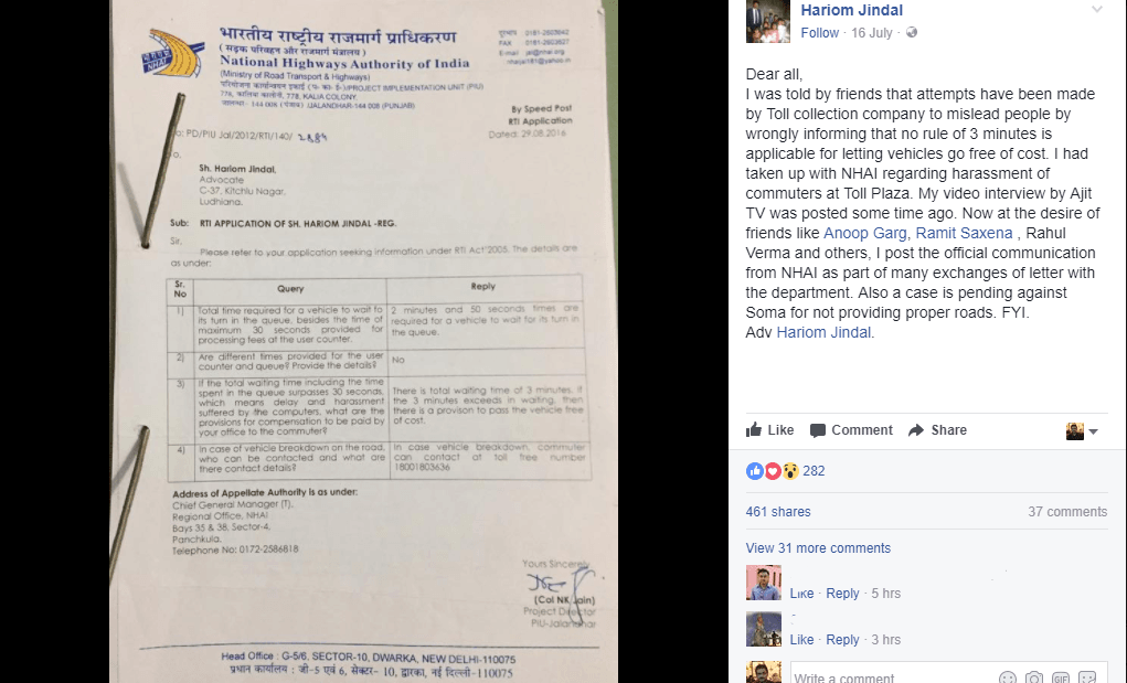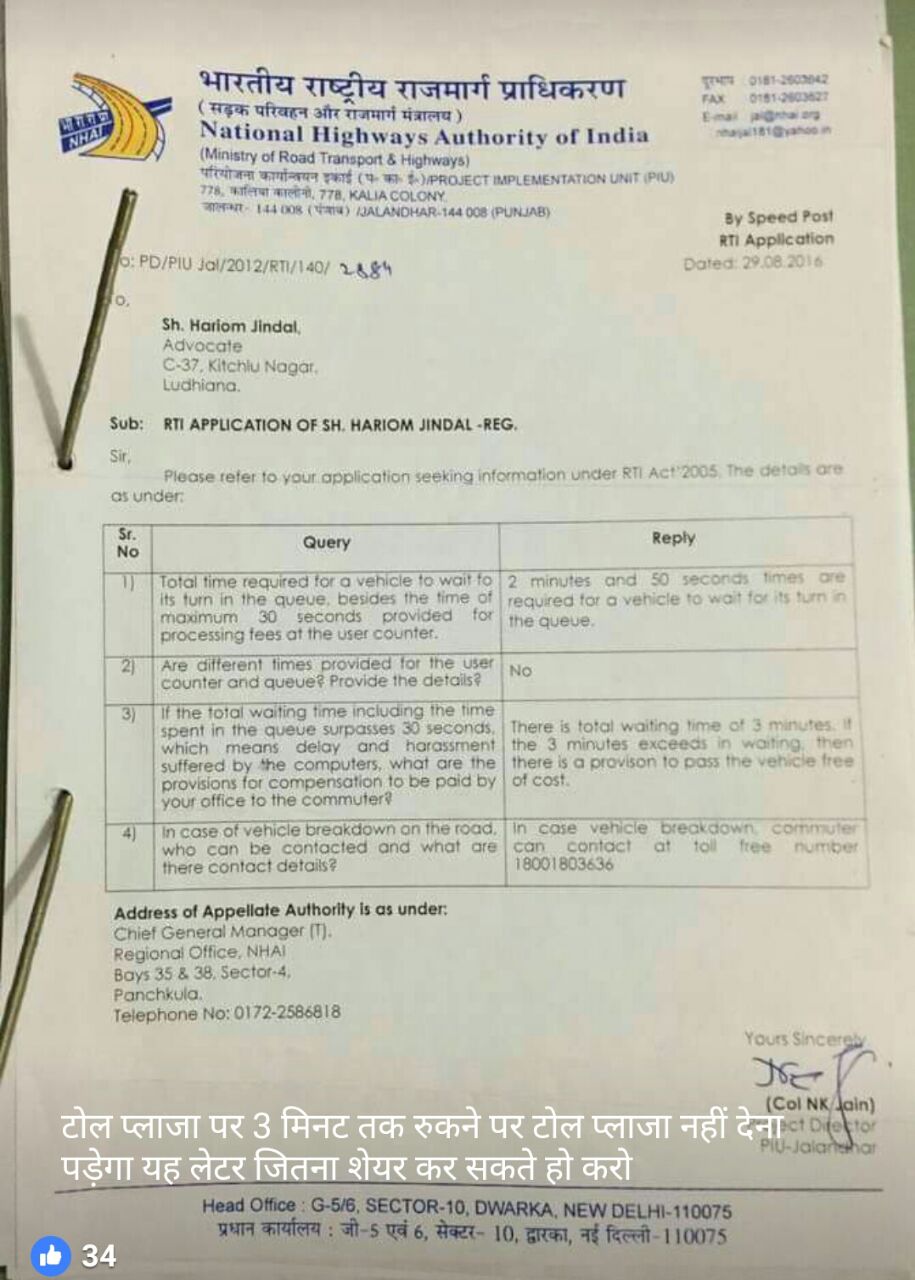 All this comes to light due to a Facebook post by Mr. Jindal. The advocate decided to spread the word and help others by posting a picture of the response he has got from the National Highway Authority of India (NHAI). In response to his query regarding the max. time in which a vehicle should clear all the procedure of toll payment, NHAI has clearly stated that the max. waiting period for any vehicle to clear the toll booth is around 2 minutes and 50 seconds. This toll plaza 3 minute rule applies to every type of vehicle, regardless of its size. Any vehicle that is unable to clear the toll payment procedure owing to traffic congestion and delays caused by the booth operator is no more bound to pay any toll fees.